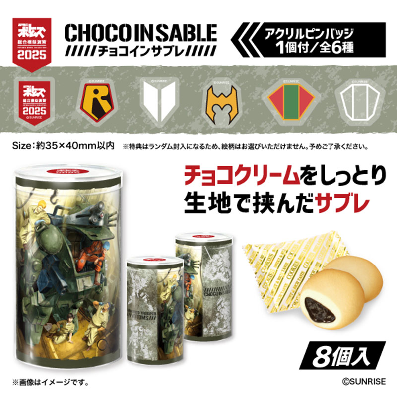 イラストが映えるパッケージに食べ応えのあるチョコインサブレが入った商品です。オマケにはアクリルピンバッジが1個(全6種ランダム)ついてきます。