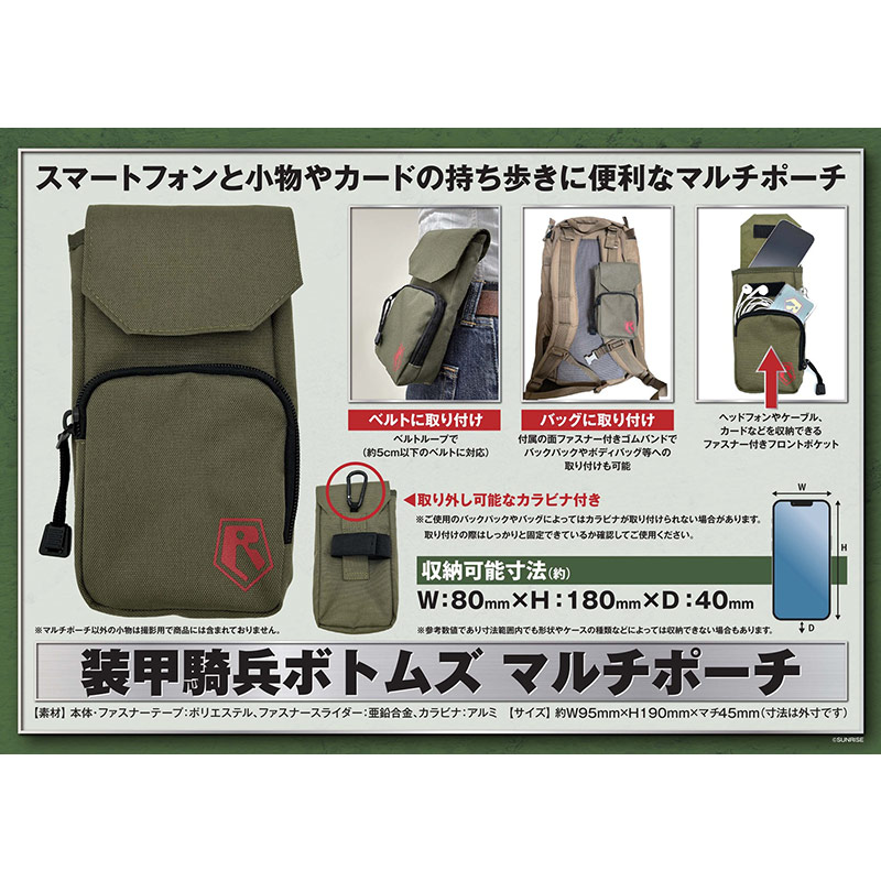 スマホなど身の回りの物の持ち歩きに便利なサイズのポーチに、さりげなくレッドショルダーロゴを配置。ベルト通しのほかゴムバンドやカラビナも付属し、いろいろな付け方に対応しています。